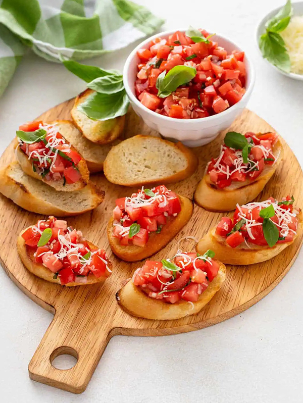 Toasted slices of baguette topped with a fresh mix of diced tomatoes, basil, garlic, and a drizzle of olive oil, all finished with a touch of balsamic glaze.
