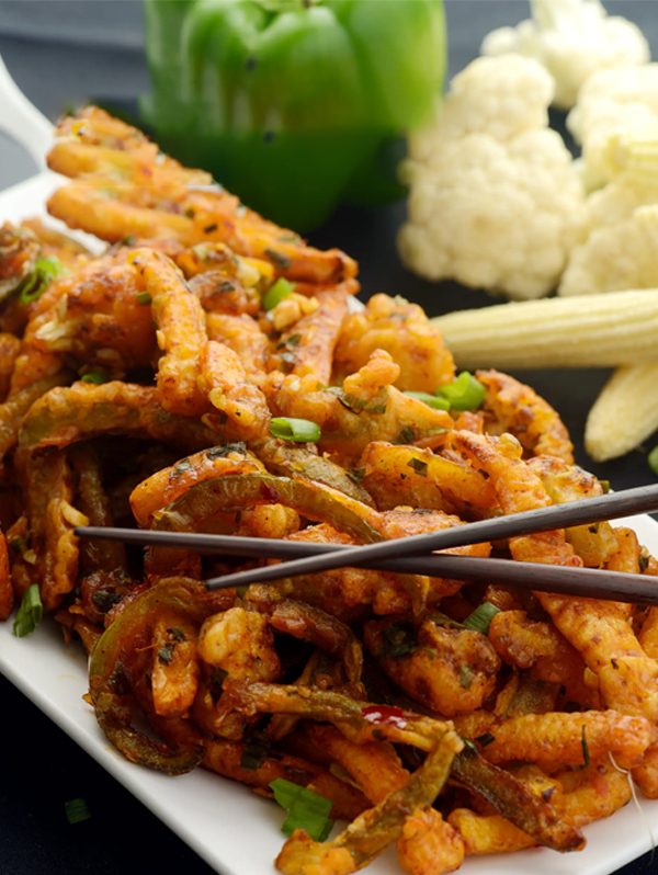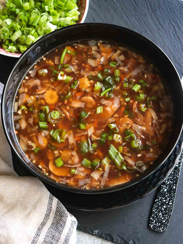 A flavorful and spicy Indo-Chinese soup, packed with fresh vegetables or tender meat, garnished with crunchy fried noodles for an extra kick.