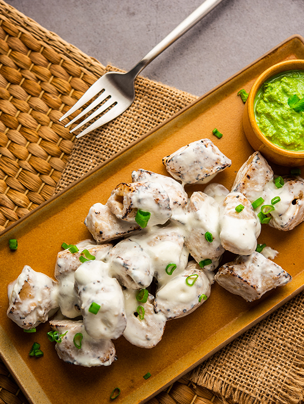 A fresh, protein-packed salad featuring tender roast chicken or creamy cottage cheese, tossed with vibrant greens, cherry tomatoes, and a flavorful basil pesto dressing. Light, wholesome, and satisfying.