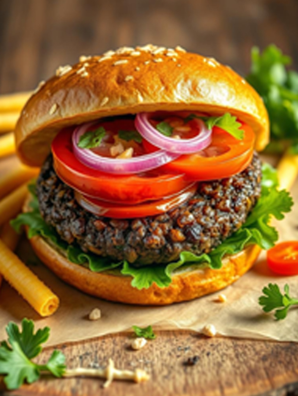 A Tex Mex veg burger features a spicy bean patty, melted cheese, fresh veggies, and zesty salsa, all tucked in a toasted bun. A flavourful, south-western-inspired treat.