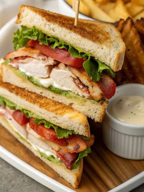 A non-veg club sandwich features layers of juicy chicken, egg lettuce, tomato, and cheese, all stacked between toasted bread slices.